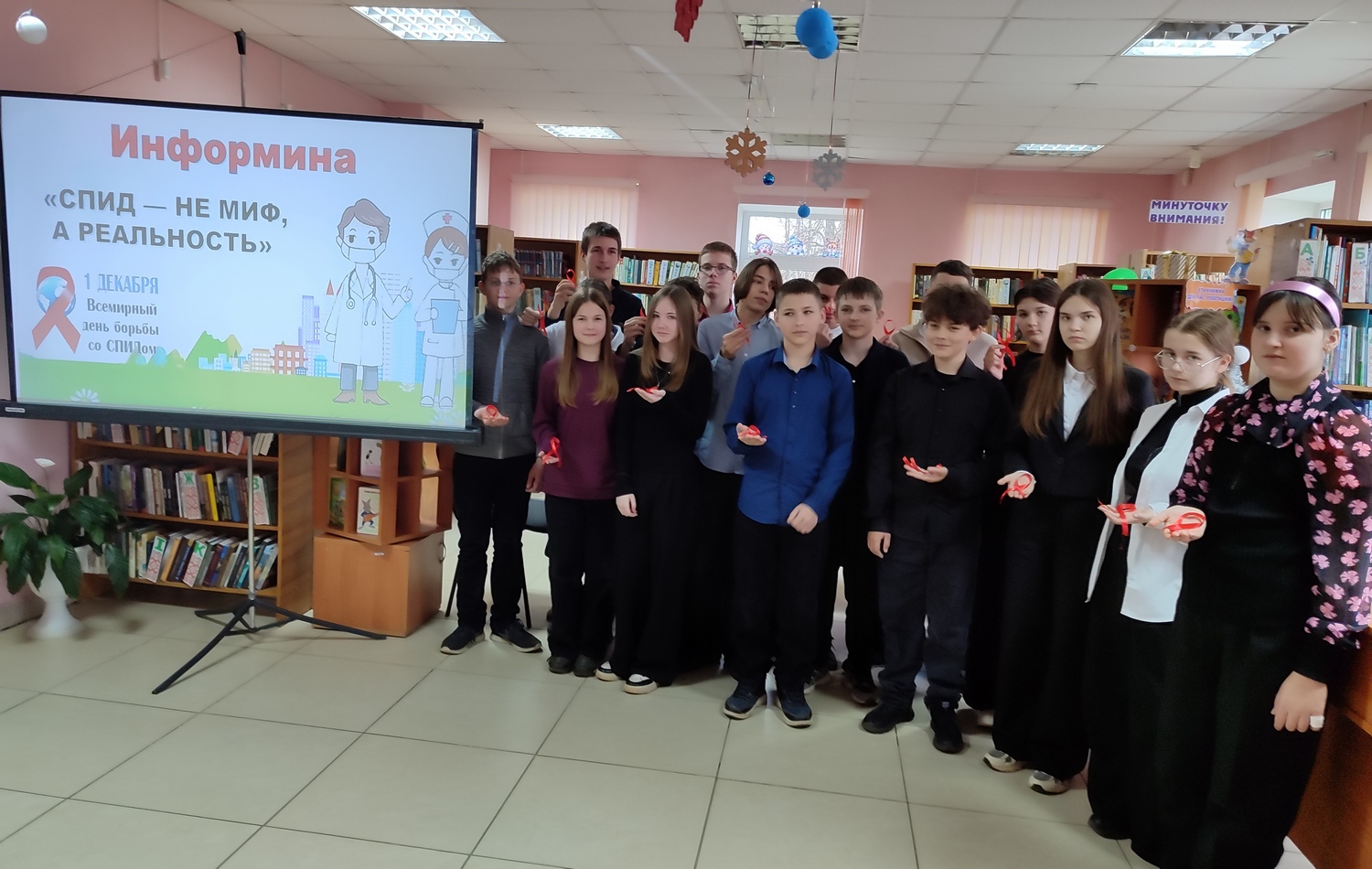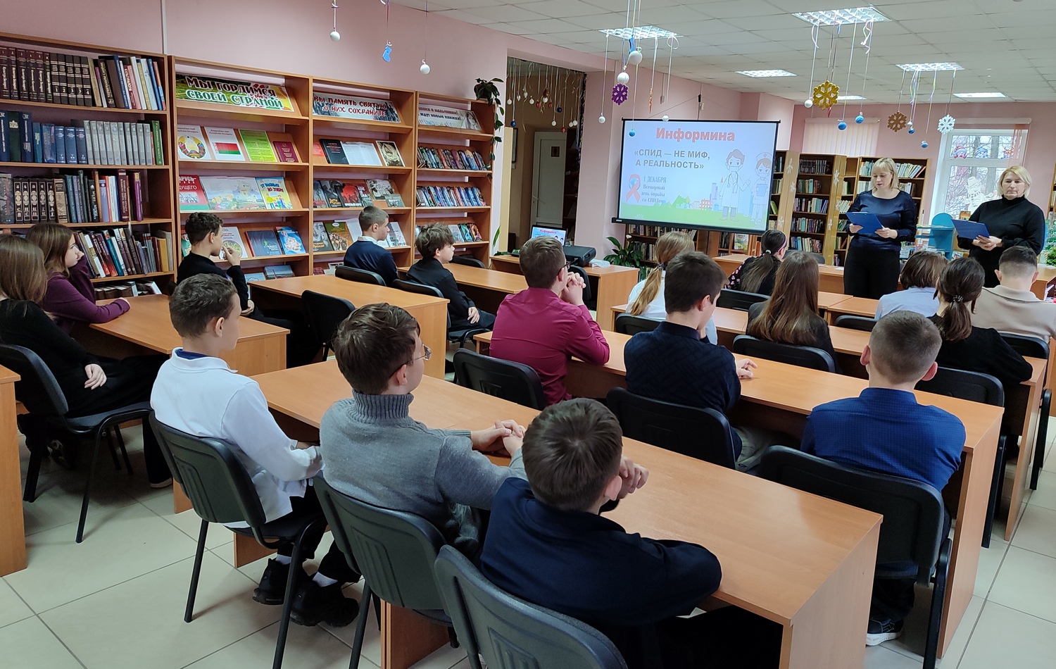К Всемирному дню борьбы со СПИДом в центральной районной библиотеке им. И.Чигринова для учащихся 8-го класса УО «Средняя школа №1» была проведена информина «СПИД – не миф, а реальность». Ведущие рассказали об истории возникновения этой коварной болезни, о том, как избежать заражения ВИЧ-инфекцией, чем отличается ВИЧ от СПИДа. Были приведены статистические данные заболеваемости СПИДом в мире, в Республике Беларусь, а также в Костюковичском районе. В ходе мероприятия ребята посмотрели видеоролик «История возникновения СПИДа», отвечали на вопросы викторины «А всё ли ты знаешь о СПИДе», а также приняли участие в игре «Риск заражения». В завершение мероприятия ведущие пожелали школьникам вести здоровый образ жизни, бережно относиться к своему здоровью.
