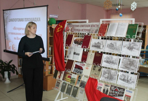 21 ноября в центральной районной библиотеке им. И.Чигринова на базе информационно-идеологического центра прошла диалоговая площадка «Исторический путь установления советской власти на Костюковщине». В открытой дискуссии приняли участие: журналист районной газеты «Голас Касцюкоўшчыны» - Ковалёв Игорь Николаевич, председатель Костюковичской районной ветеранской организации – Терехова Светлана Дмитриевна, ветераны, руководитель и члены первичной организации РГОО «Белорусское общество «Знание» отдела культуры Костюковичского райисполкома и учащаяся молодёжь. В ходе диалога, который состоялся между участниками, говорили о том, какое глобальное влияние оказала Октябрьская революция 1917 года на ход мировой истории, будущее многих народов, в том числе белорусского. Во многом благодаря этому событию наш народ обрёл государственность. В продолжение темы Игорь Николаевич остановил своё внимание на том, как происходило установление советской власти на Костюковщине, какие события этому сопутствовали. В ходе беседы вспомнили известных земляков, уроженцев Костюковщины, связанных, так или иначе, с революционными событиями. Участники мероприятия смогли задать интересующие вопросы, а также поделиться своим мнением по теме встречи. Сотрудники библиотеки провели для присутствующих обзор информационной выставки «Установление советской власти: страницы истории», на которой были представлены документальные издания, книги художественной литературы, отражающие революционные и послереволюционные события, а также фотоснимки празднования 70-летия Октябрьской революции на Костюковщине. Больше фото >>>