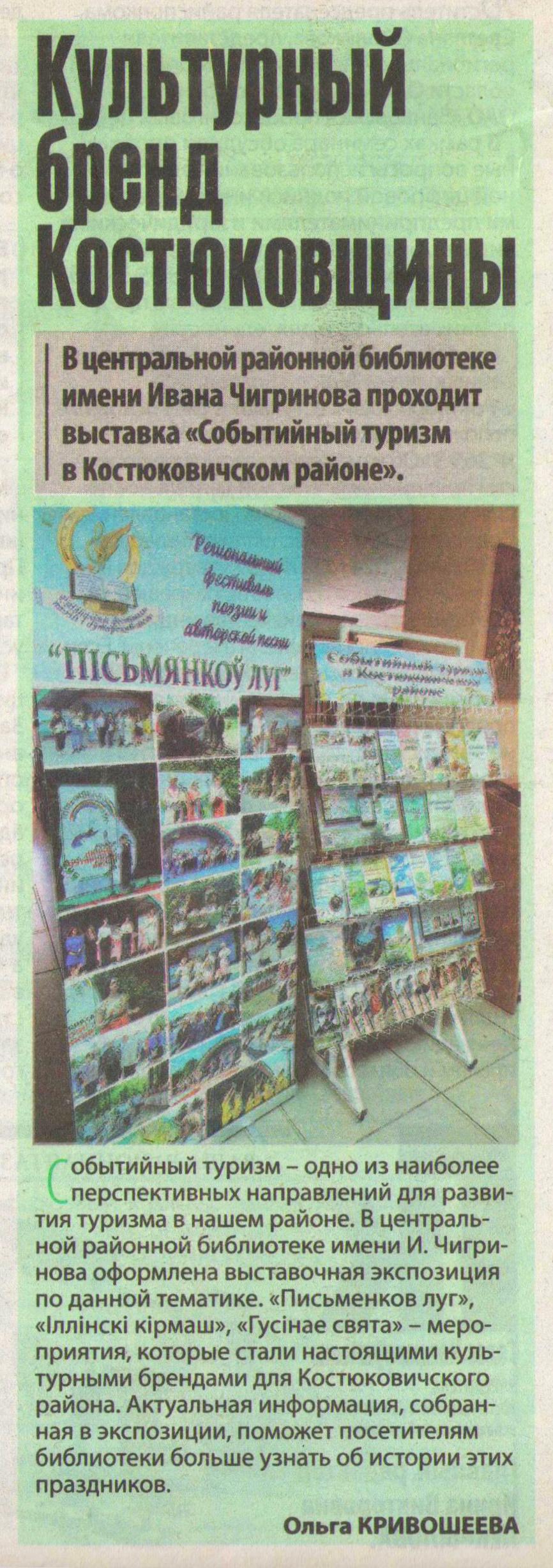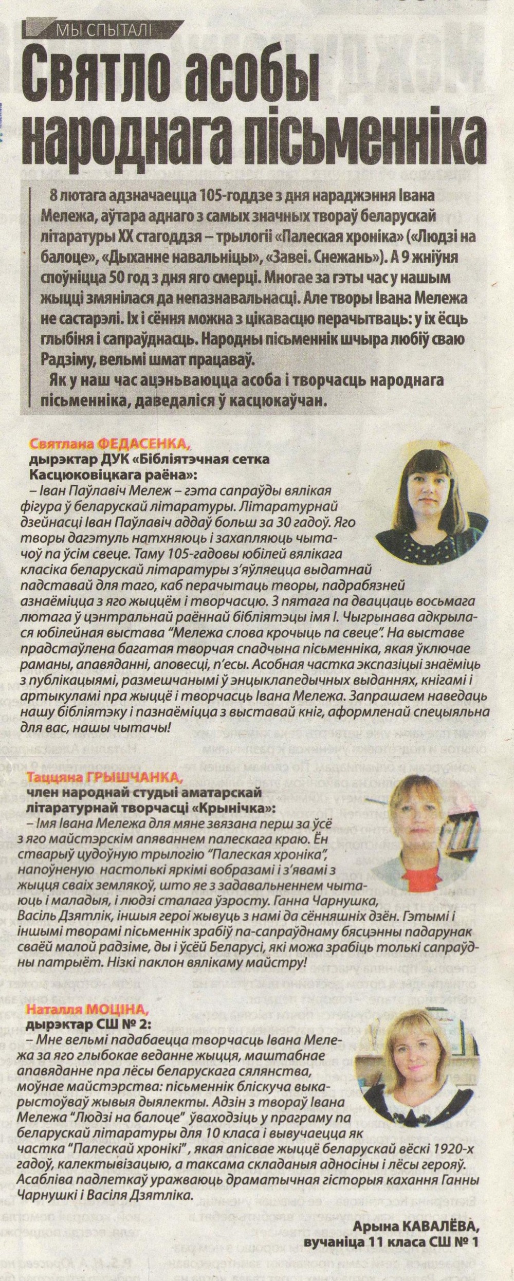 27. Петрусевич, И. Эффективная работа дает эффективный результат. Итоги работы культуры за 2014 год / Ирина Петрусевич // Голас Касцюкоўшчыны. — 2015. — 11 лютага. — С. 1, 5.