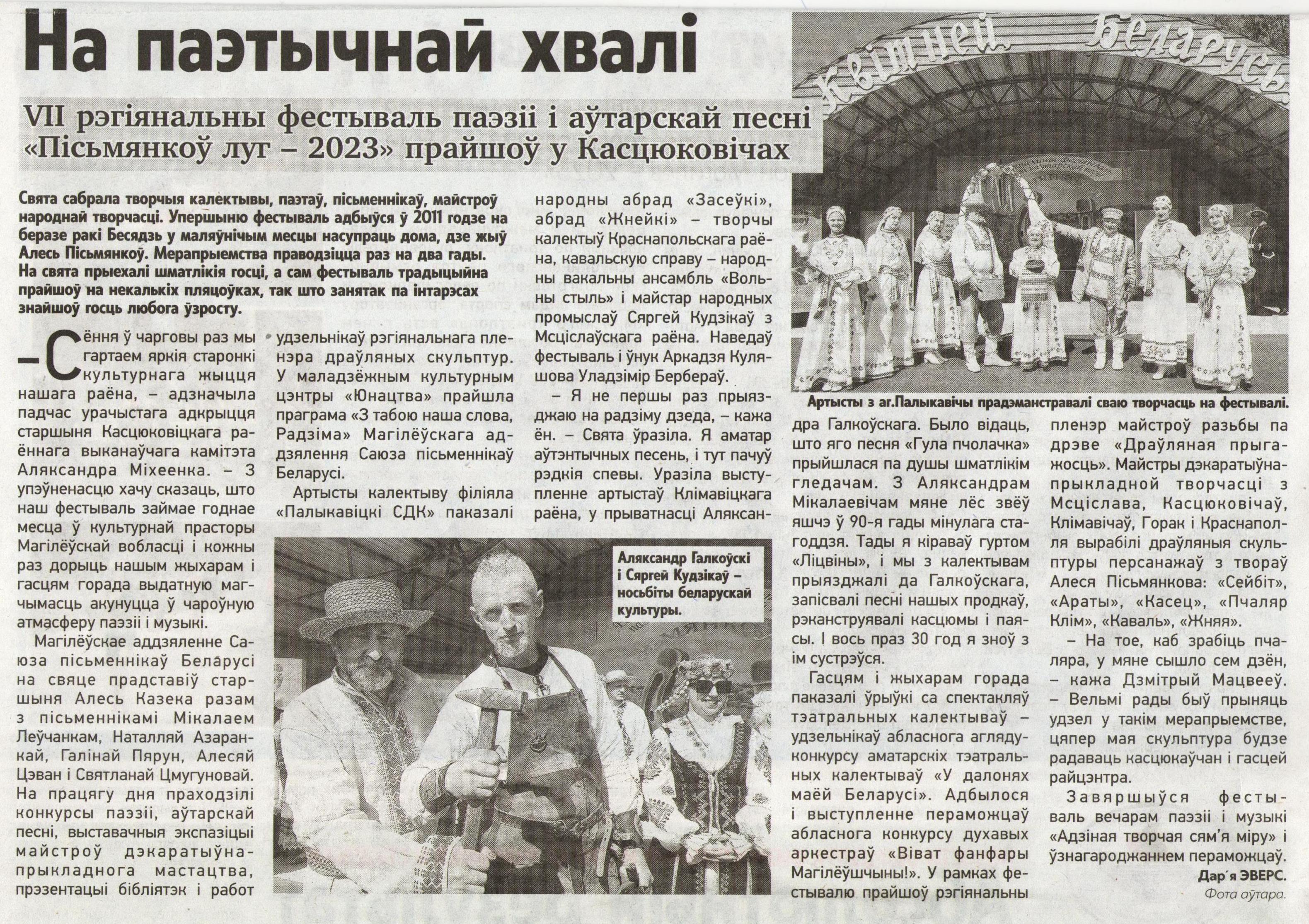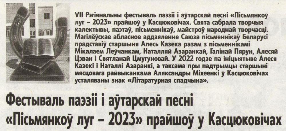 3. Казека, А. Фестываль паэзіі і аўтарскай песні “Пісьмянкоў луг - 2023” прайшоў у Касцюковічах / Алесь Казека, Святлана Казека // Магілёўскія ведамасці. — 2023. — 30 мая. — С. 12.