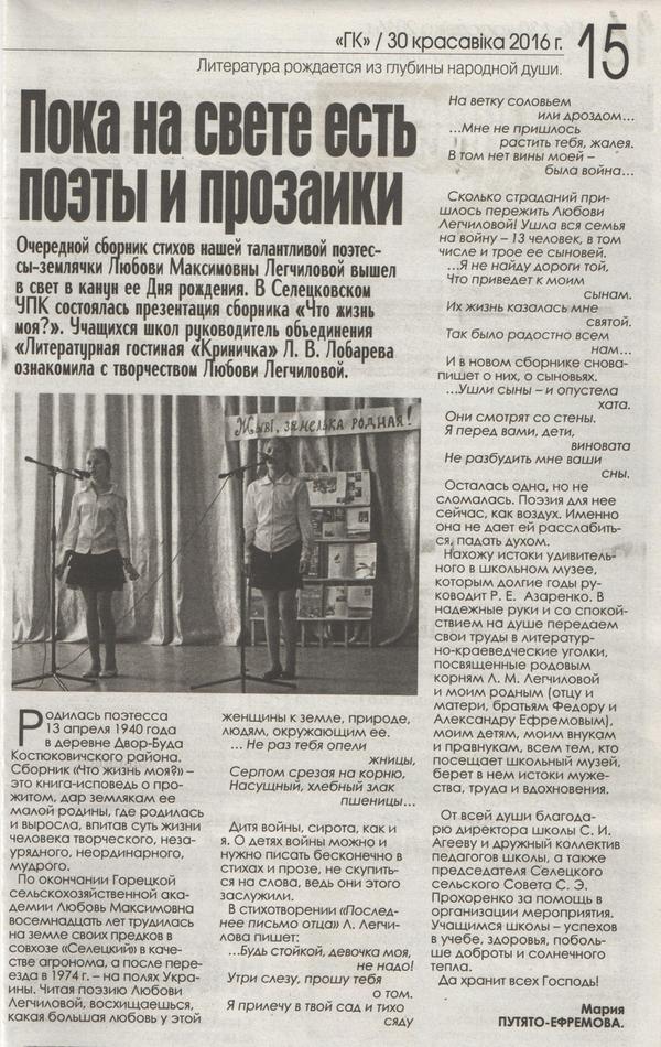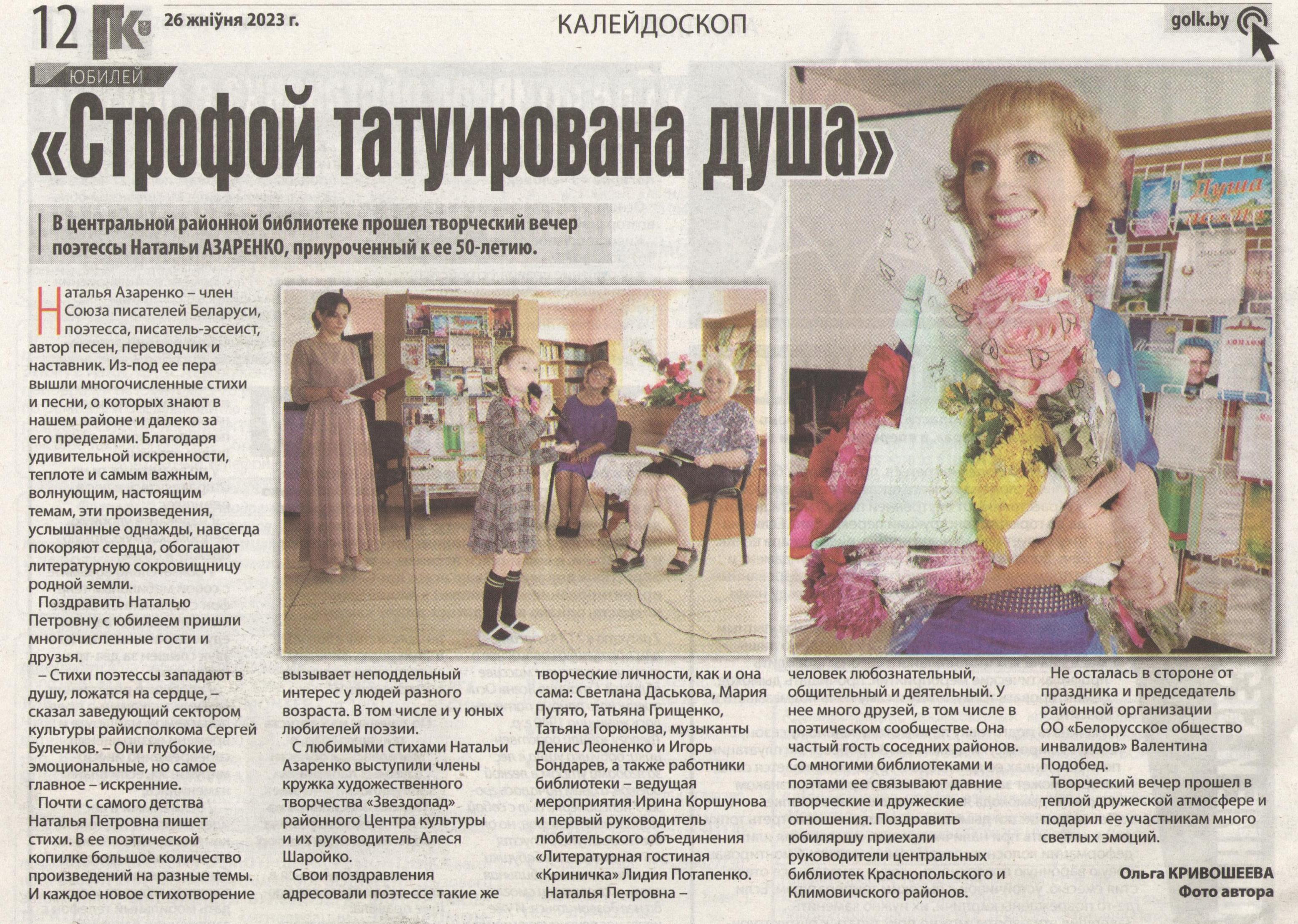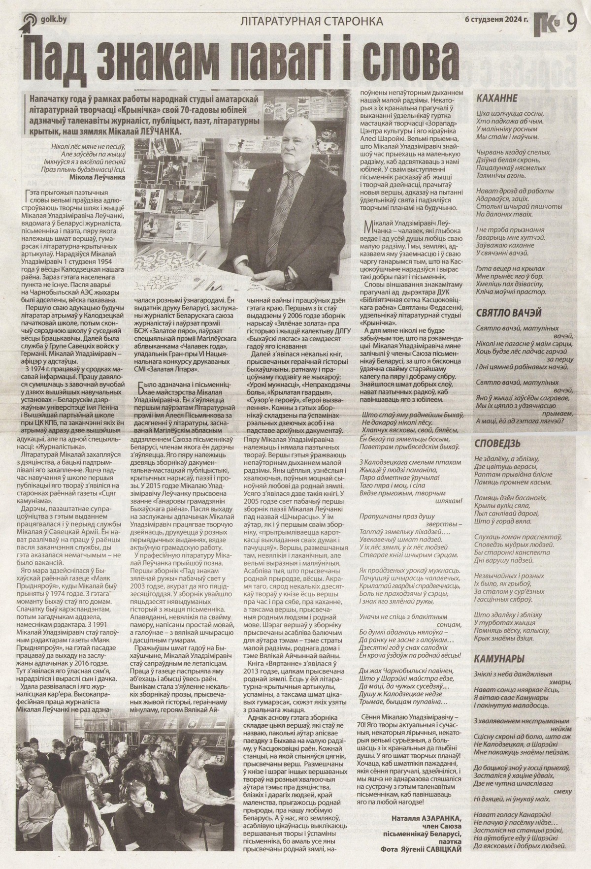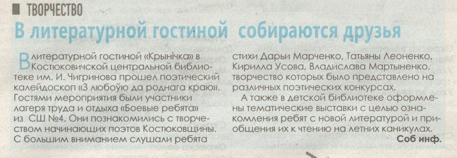 9. В Костюковичах состоялся отчет народного любительского объединения «Літаратурная гасцёўня «Крынічка» [Электронный ресурс] // Голас Касцюкоўшчыны : сайт. — Режим доступа: https://golk.by/v-kostjukovichah-sostojalsja-otchet-narodnogo-ljubitelskogo-obedinenija-litaraturnaja-gascjo-nja-krynichka.html. — Дата доступа: 04.07.2022.
