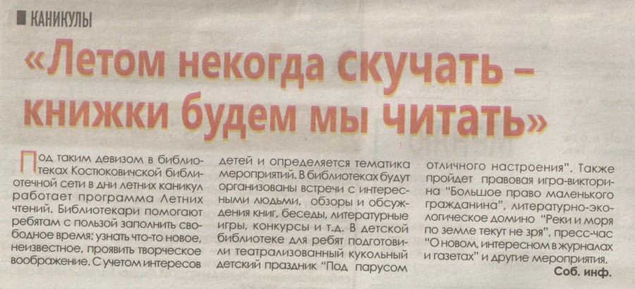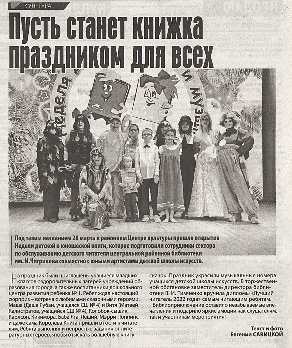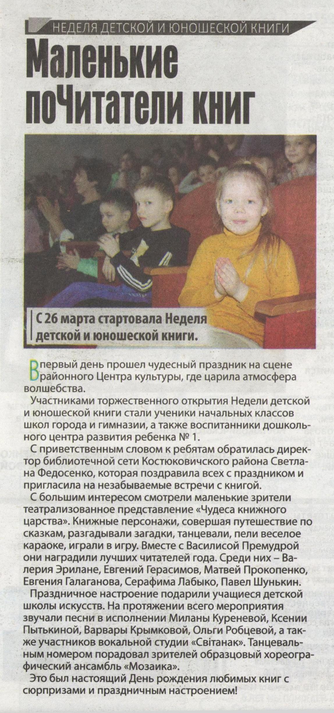 13. Торжественное открытие Недели детской и юношеской книги «Путешествие по волшебной стране» состоялось в Костюковичах [Электронный ресурс] // Голас Касцюкоўшчыны : сайт. — Режим доступа: https://golk.by/torzhestvennoe-otkrytie-nedeli-detskoj-i-junosheskoj-knigi-puteshestvie-po-volshebnoj-strane-sostojalos-v-kostjukovichah.html. — Дата доступа: 30.03.2022.