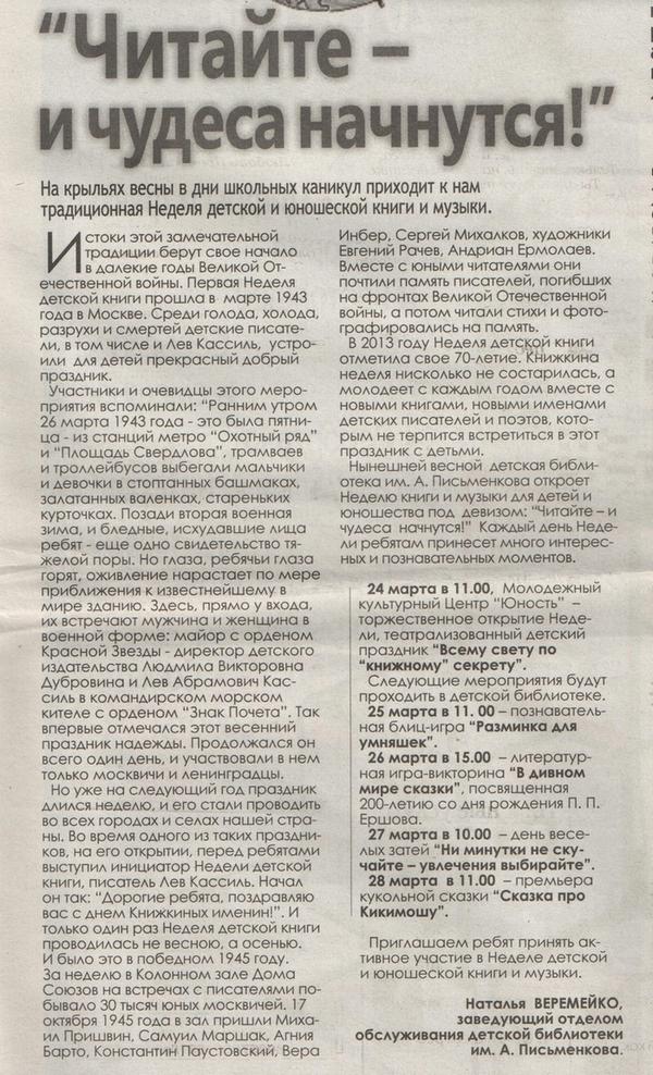22. Веремейко, Н. Читайте и чудеса начнутся / Наталья Веремейко // Голас Касцюкоўшчыны. — 2015. — 18 сакавіка. — С. 11.