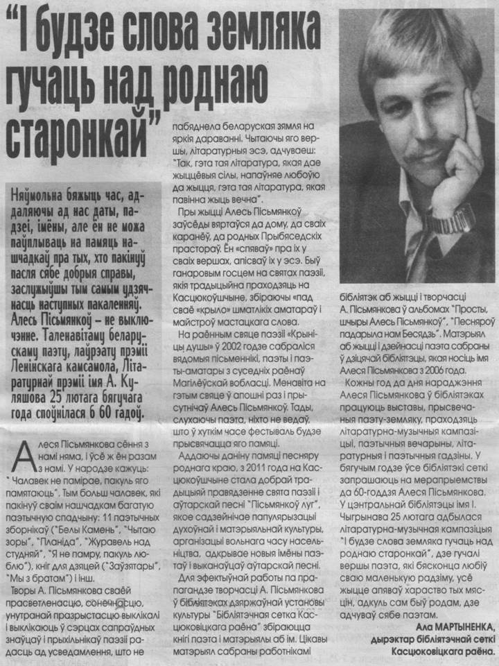 24. Гонар Касцюковіцкага краю – Алесь Пісьмянкоў // Голас Касцюкоўшчыны. — 2015. — 11 сакавіка. — С. 4.