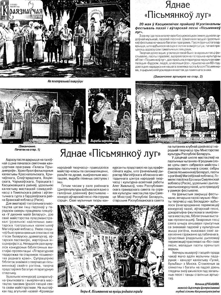 24. Дробышава, Н. На “Пісьмянковм лузе” зноў талентаў парад / Наталля Дробышава // Культура. — 2013. — 1 чэрвеня. — С. 4.