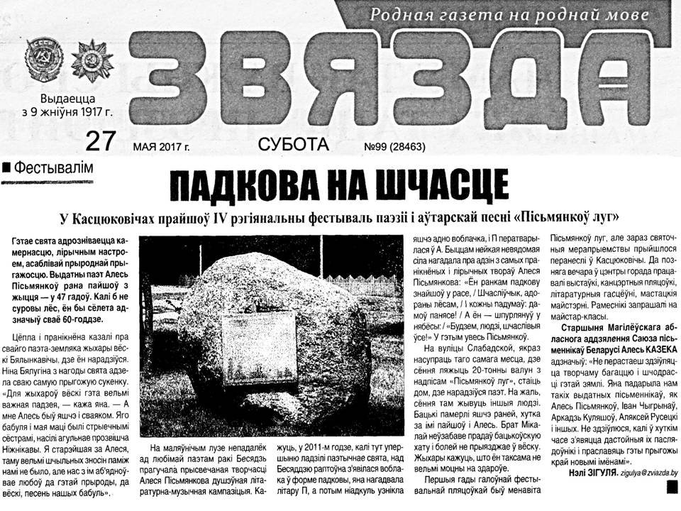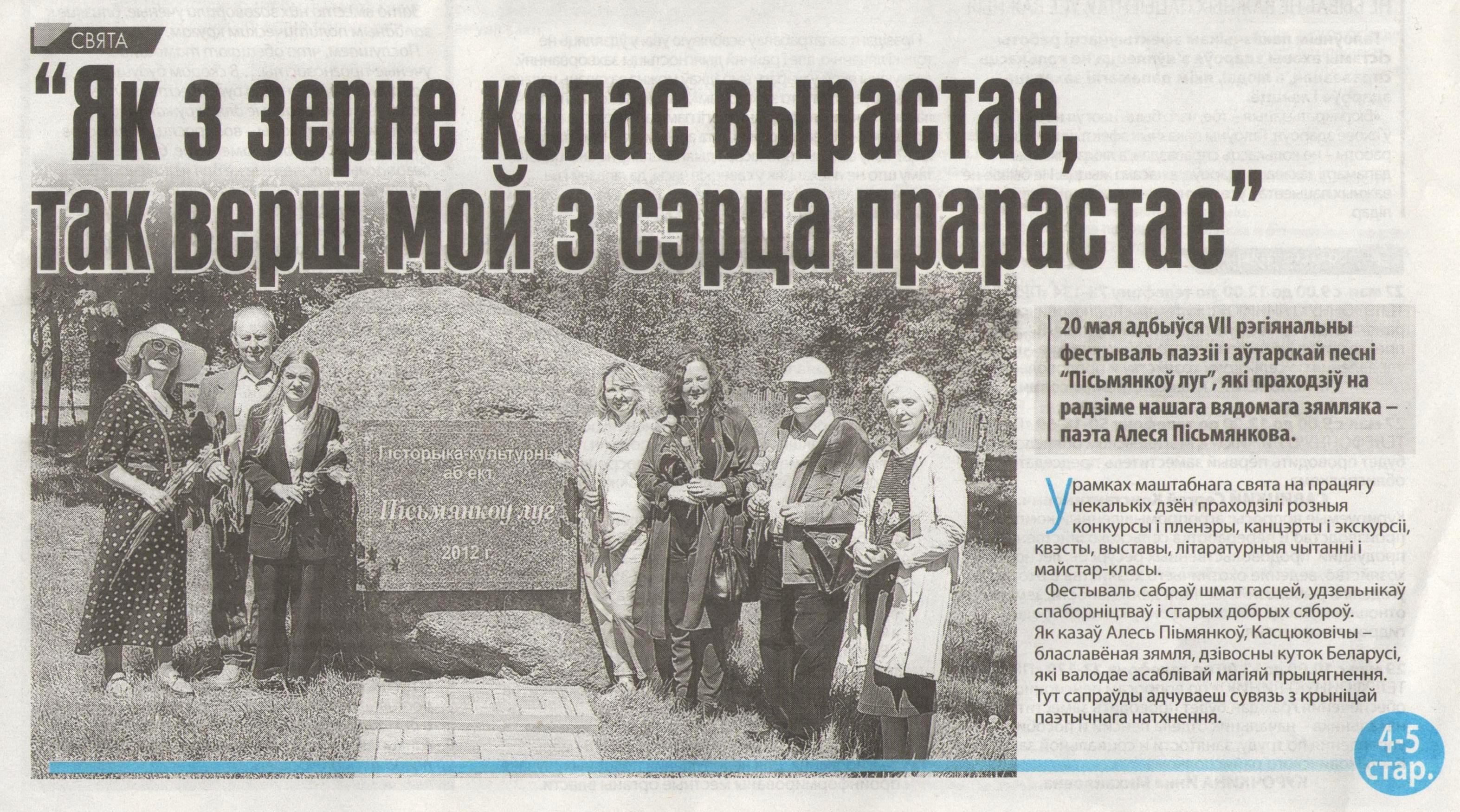 25. 24 - 25 мая – свята паэзіі і аўтарскай песні “Пісьмянкоў луг” // Голас Касцюкоўшчны. — 2013. — 22 мая. — С. 2.