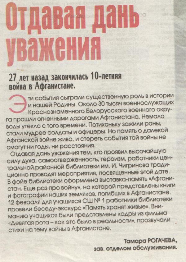 13. ...Час памяти прошел в центральной библиотеке им. И. Чигринова // Голас Касцюкоўшчыны. — 2018. — 24 сакавіка. — С. 1.