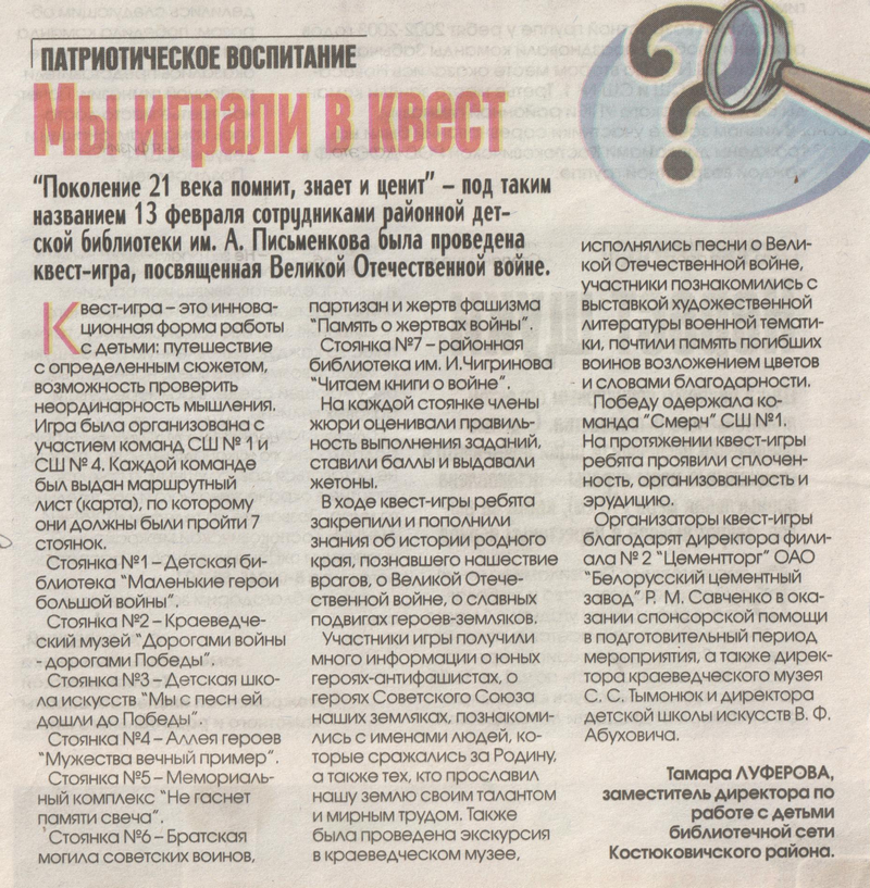 23. Муращенко, Л. Встреча поколений. 70 мирных лет / Людмила Муращенко // Голас Касцюкоўшчыны. — 2015. — 14 сакавіка. — С. 8.