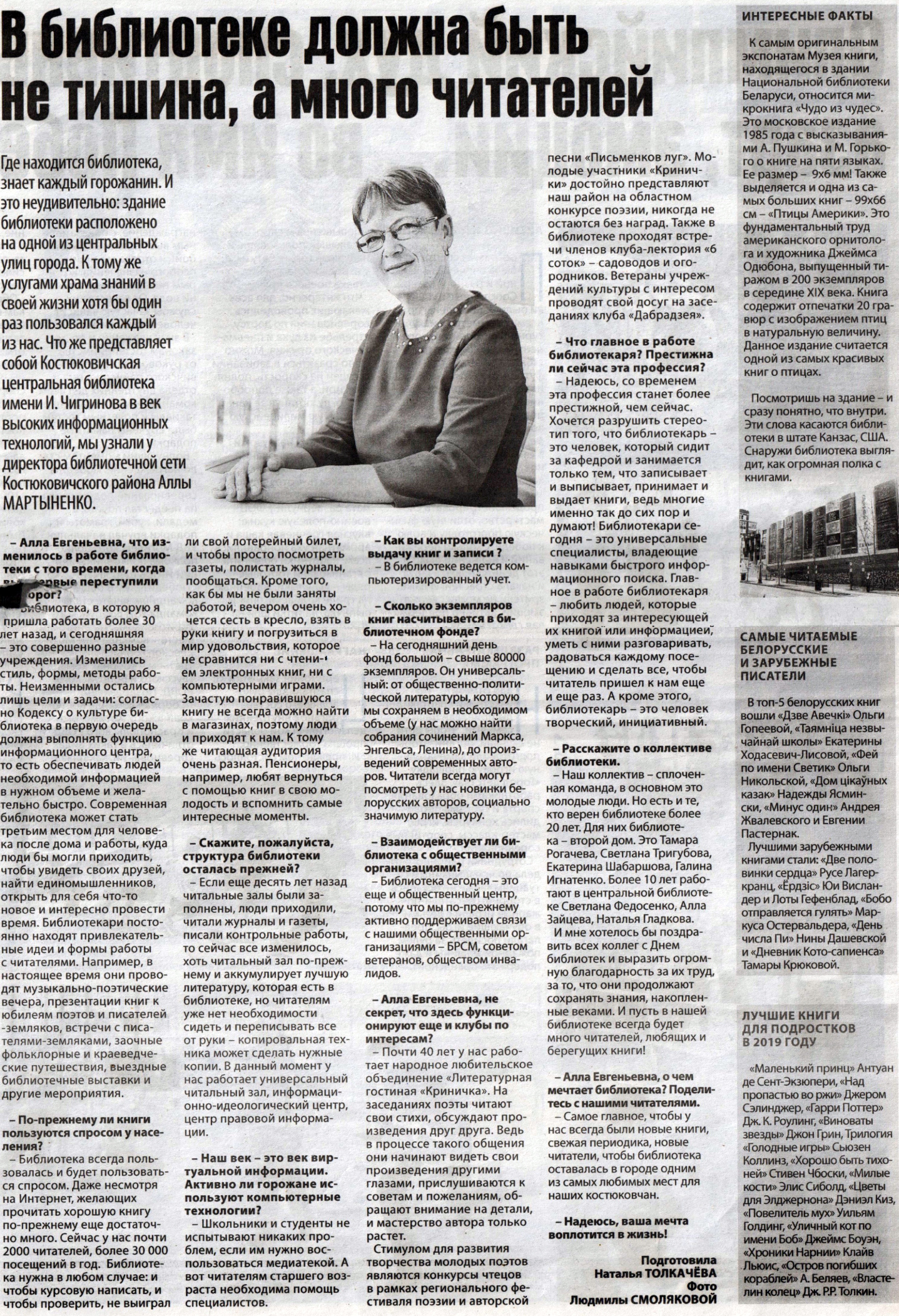 6. Толкачёва, Н. В библиотеке должна быть не тишина, а много читателей / Наталья Толкачёва // Голас Касцюкоўшчыны. — 2019. — 11 верасня. — С. 3.