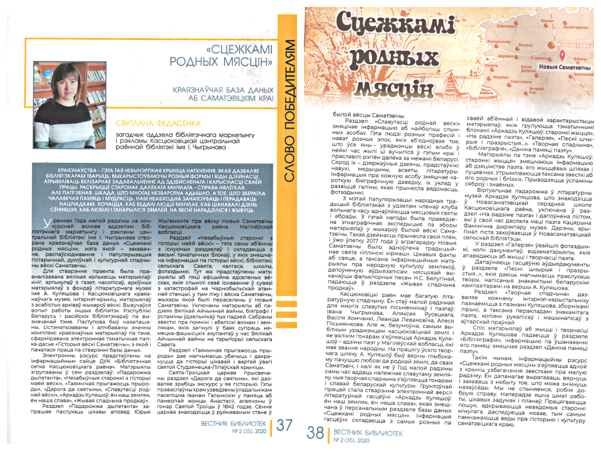 1. Федасенка, С. «Сцежкамі родных мясцін» : краязнаўчая база даных аб Саматэвіцкім краі / Святлана Федасенка // Вестник библиотек. — 2020. — №2. — С. 37—38.