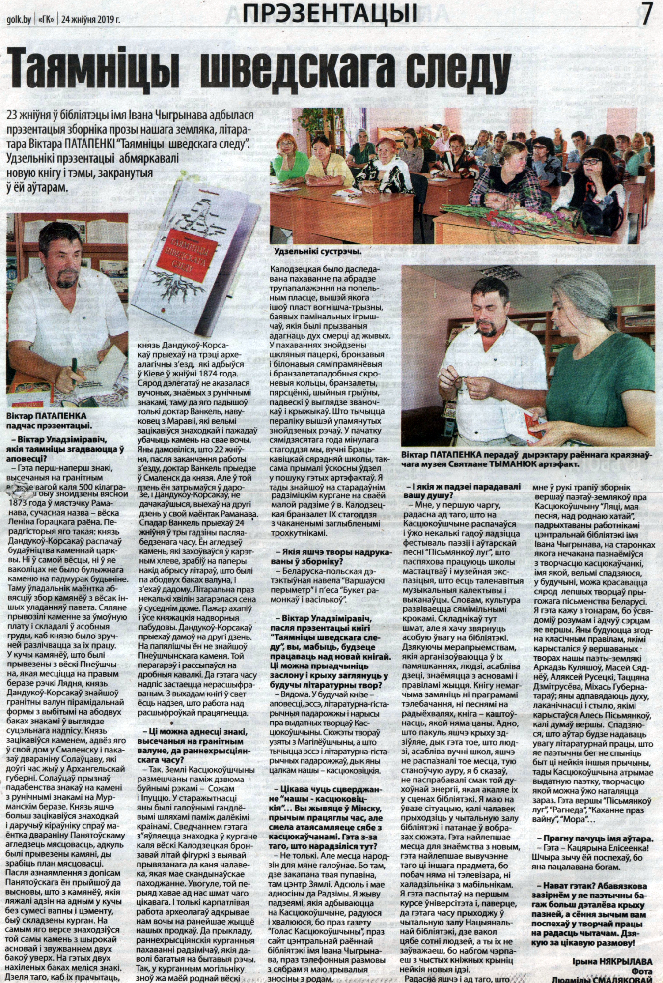 7. Някрылава, І. Таямніцы шведскага следу / Ірына Някрылава // Голас Касцюкоўшчыны. — 2019. — 24 жніўня. — С. 7.