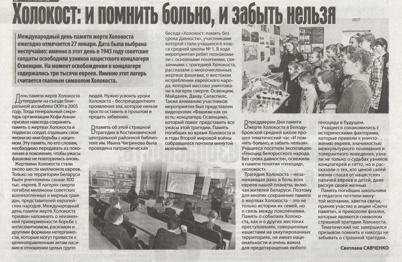 12. В районной библиотеке вспомнили о Международном дне освобождения узников фашистских концлагерей [Электронный ресурс] // Голас Касцюкоўшчыны : сайт. — Режим доступа: https://golk.by/v-rajonnoj-biblioteke-vspomnili-o-mezhdunarodnom-dne-osvobozhdenija-uznikov-fashistskih-konclagerej.html. – Дата доступа: 12.04.2021.