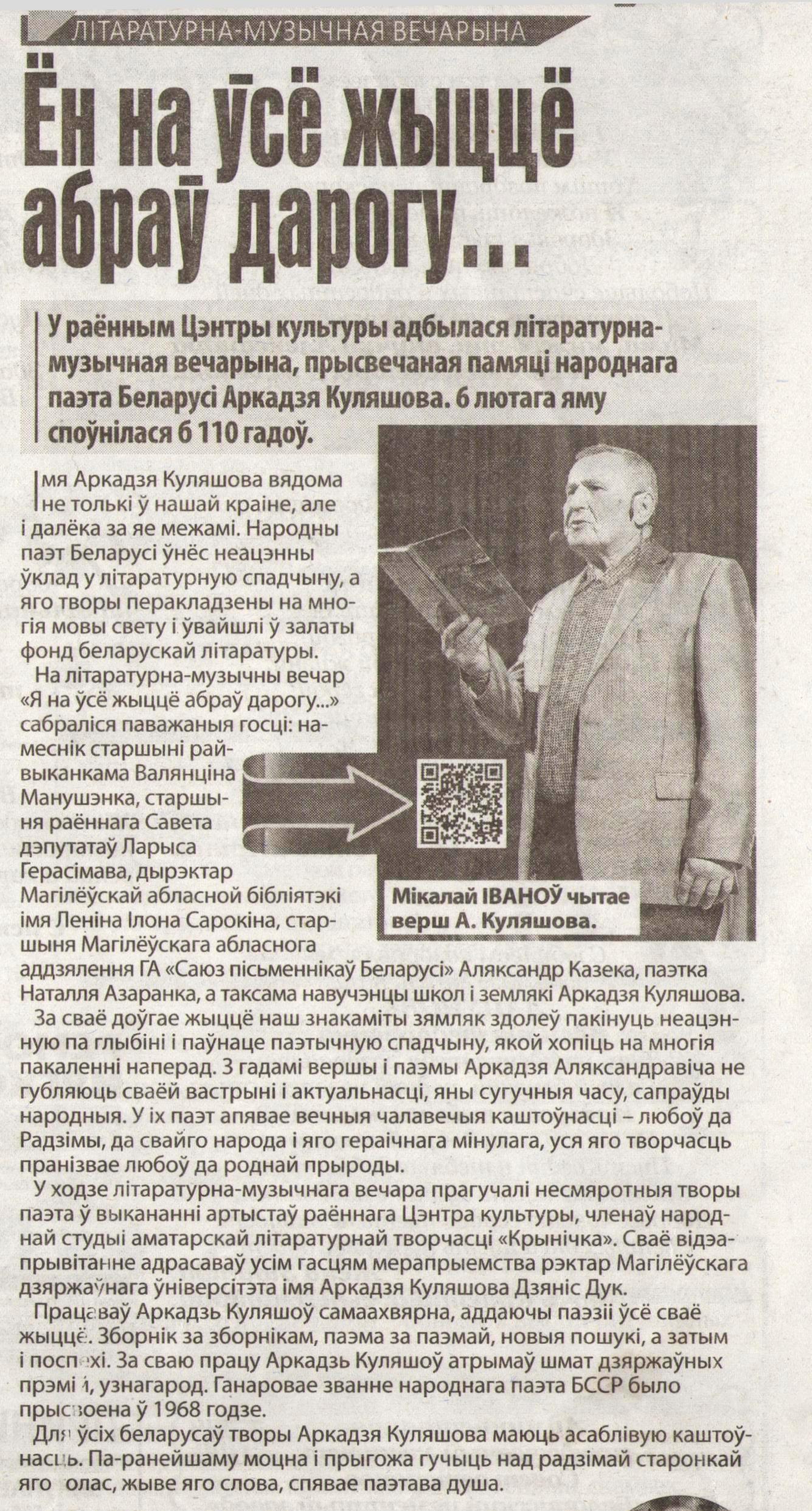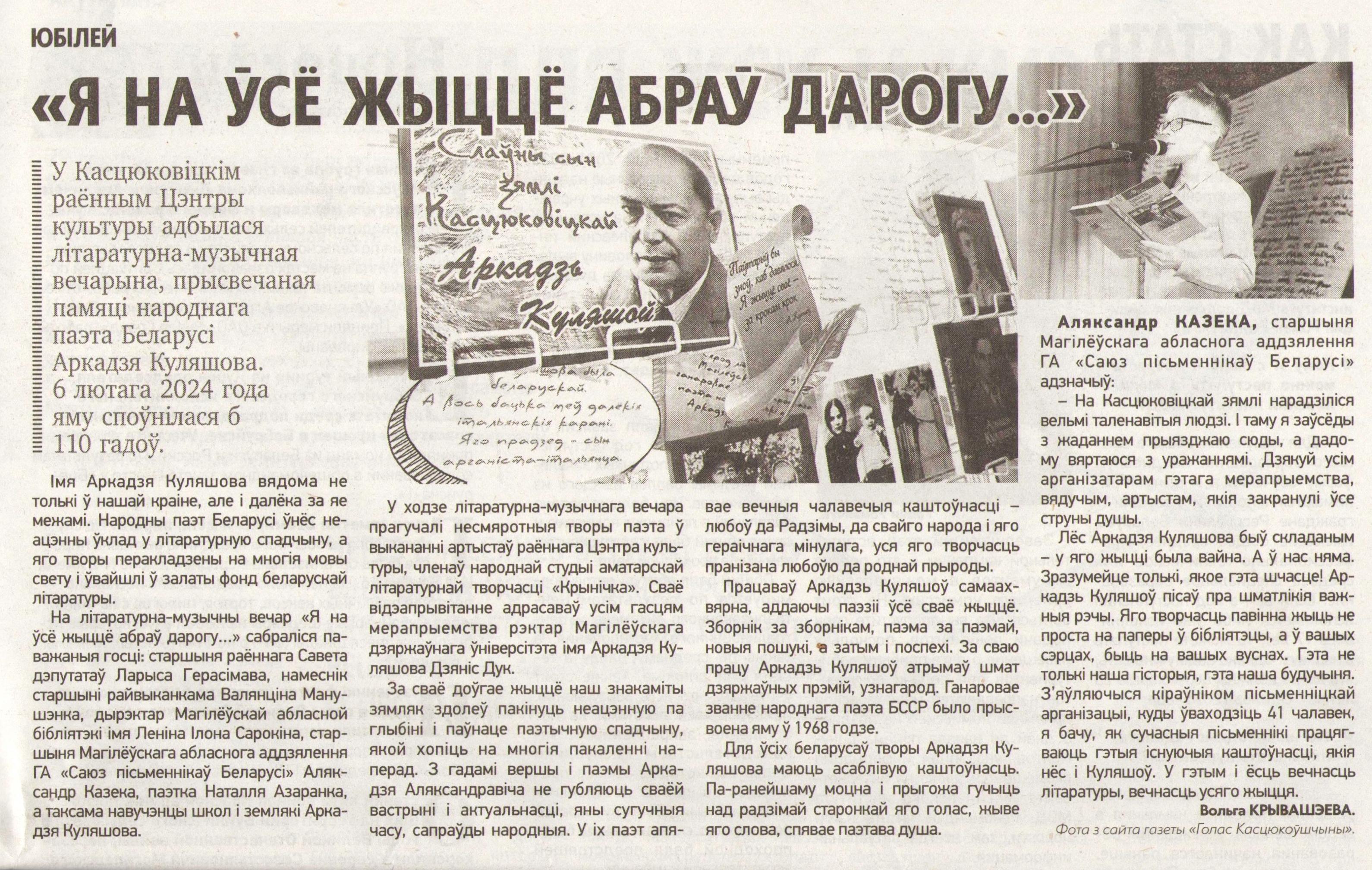 Касцюковіцкая цэнтральная раённая бібліятэка імя І. Чыгрынава падрыхтавала шэраг мерапрыемстваў да 100-годдзя А. Куляшова, урадж. в. Саматэвічы Касцюковіцкага раёна.