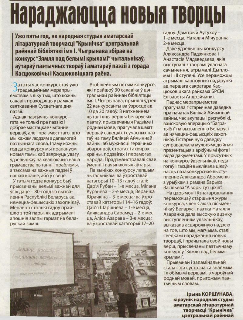 4. Ковалёва, Н. Белынковичи / Наталья Ковалёва // Голас Касцюкоўшчыны. — 2013. — 12 января. — С. 9.
