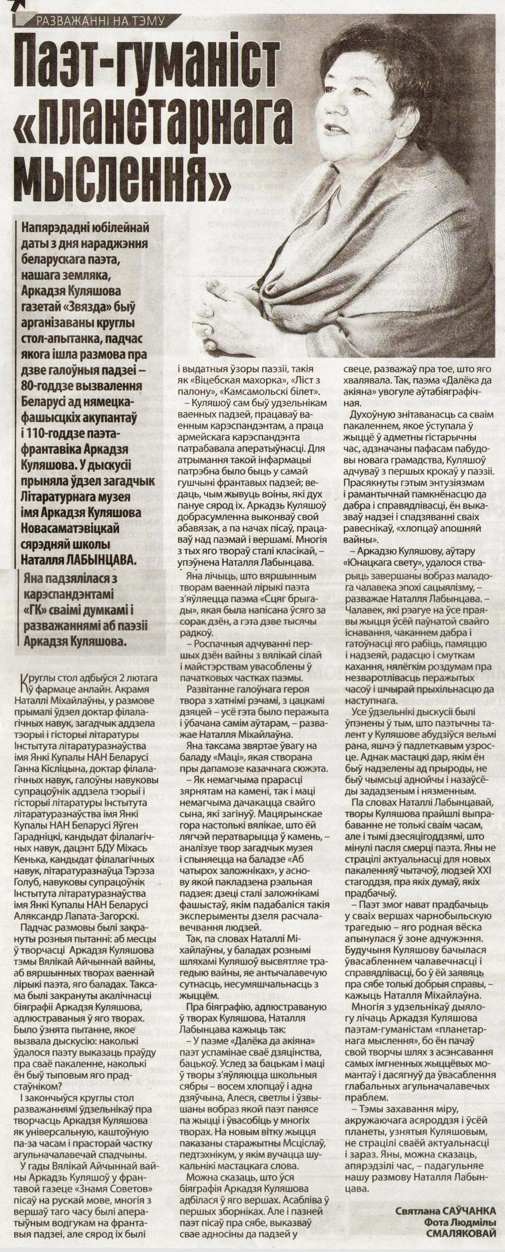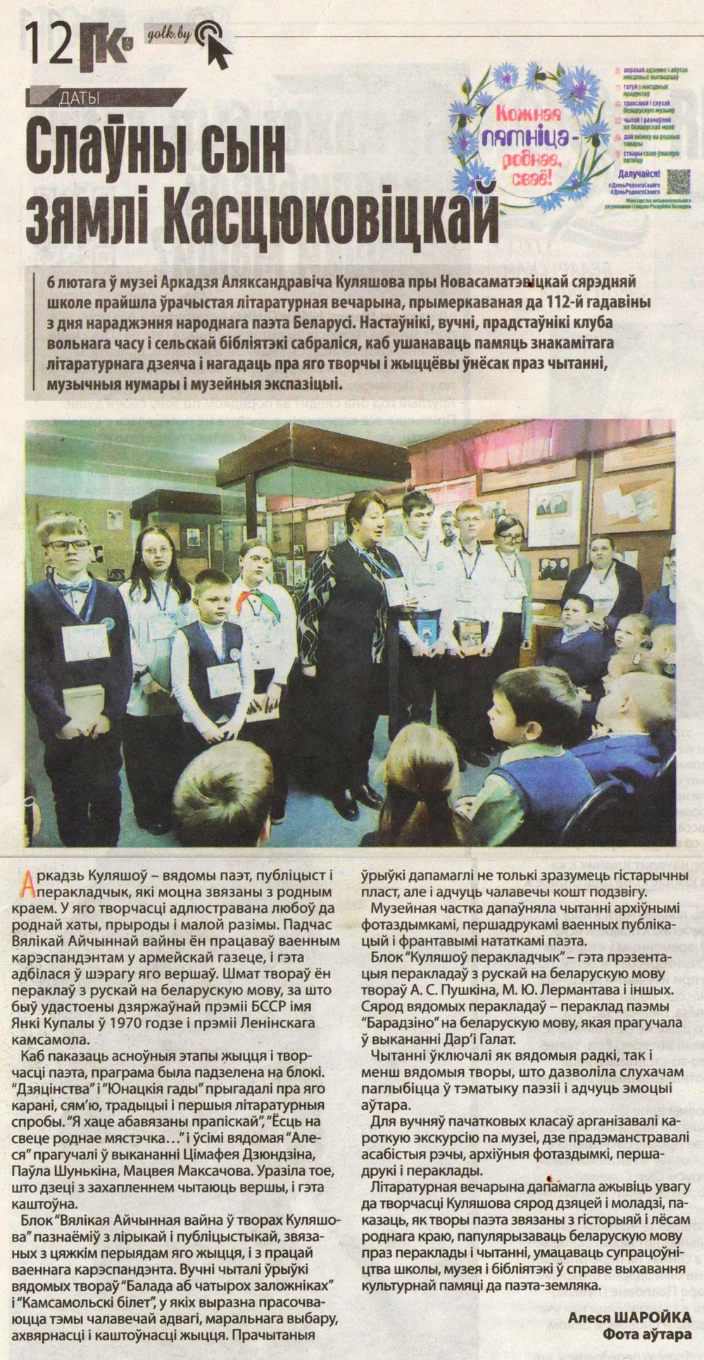 25. Патапенка, Л. Урокі жыцця А. Куляшова / Лідзія Патапенка // Голас Касцюкоўшчыны. — 2013. — 1 чэрвеня. — С. 4.