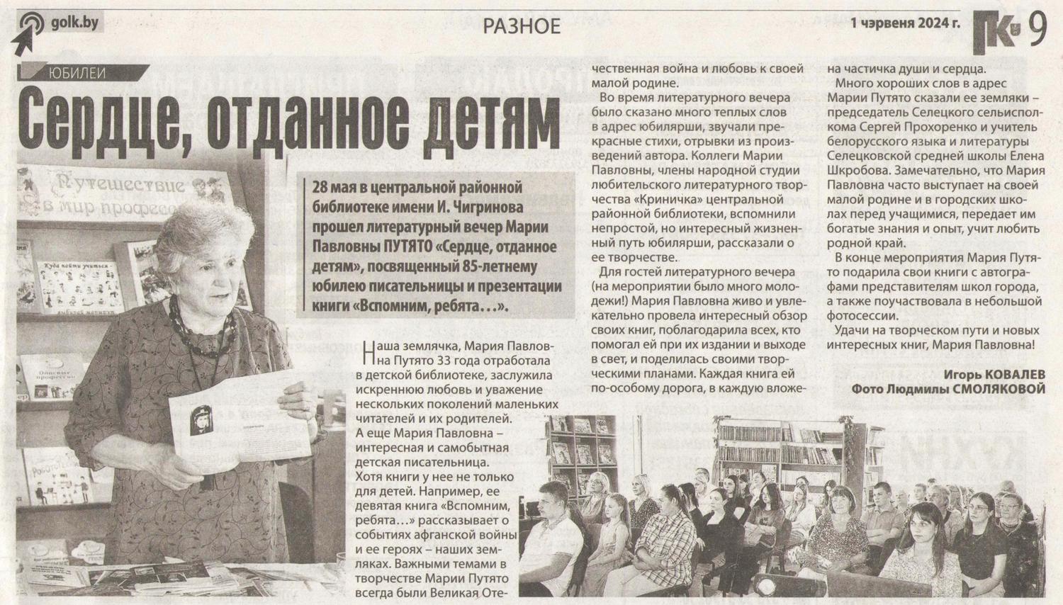 15. Ковалев, И. Сердце, отданное детям / Игорь Ковалев ; фото Людмилы Смоляковой // Голас Касцюкоўшчыны. — 2024. — 1 чэрвеня. — С. 9.