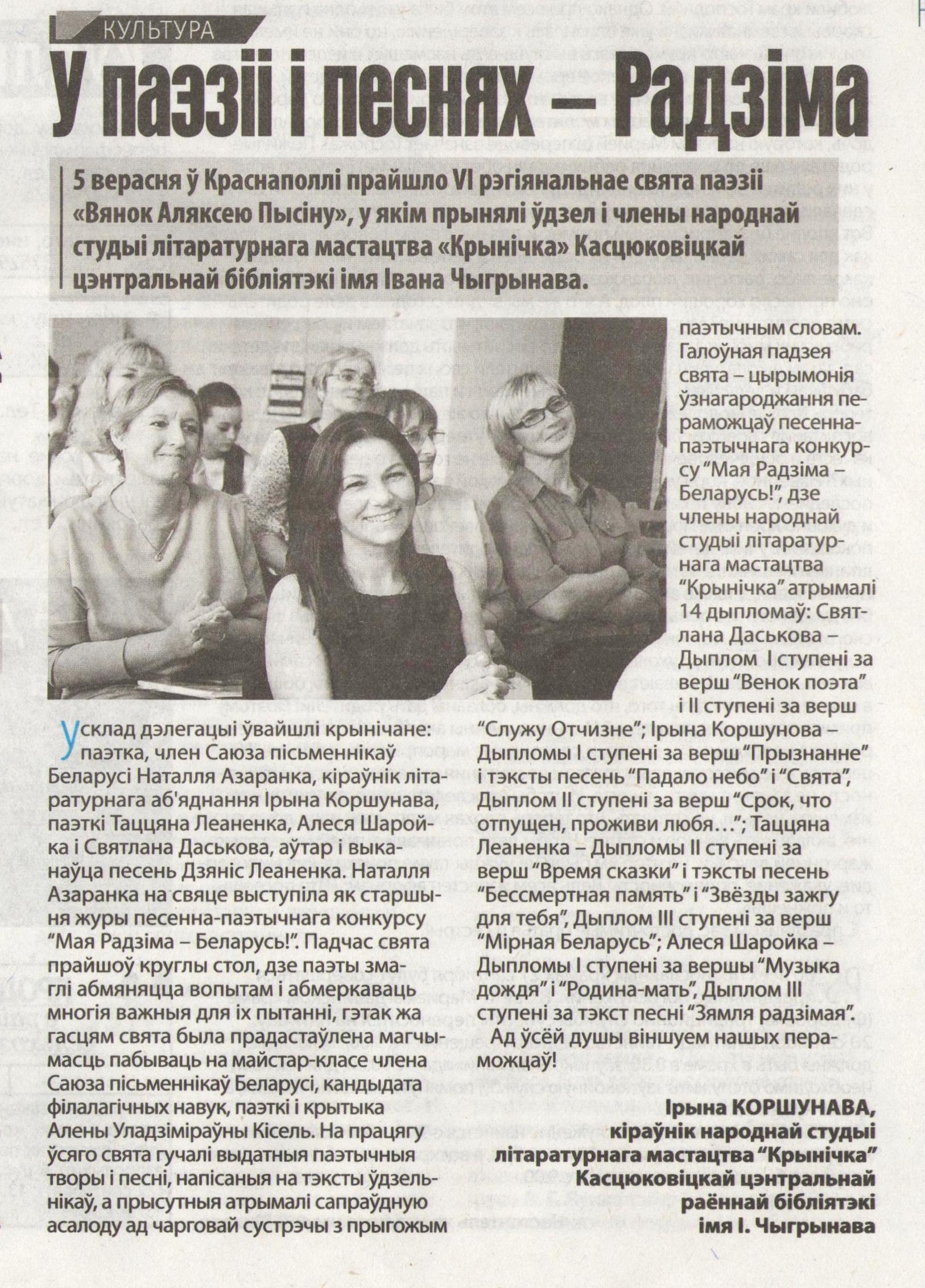 10. Дробышава, Н. Аб’яднала мастацтва / Наталья Дробышава // Голас Касцюкоўшчыны. — 2018. — 9 чэрвеня. — С. 6.
