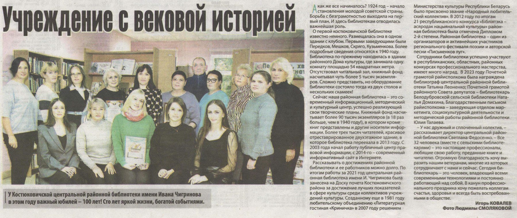 9. Ковалев, И. Учреждение с вековой историей / Игорь Ковалев ; фото Людмилы Смоляковой // Голас Касцюкоўшчыны. — 2024. — 12 кастрычніка. — С. 6 — 7.