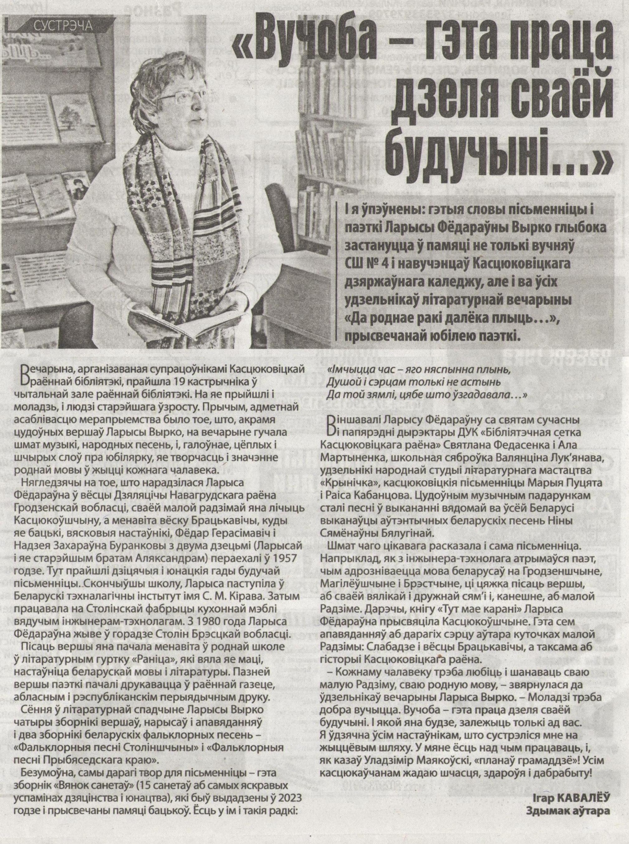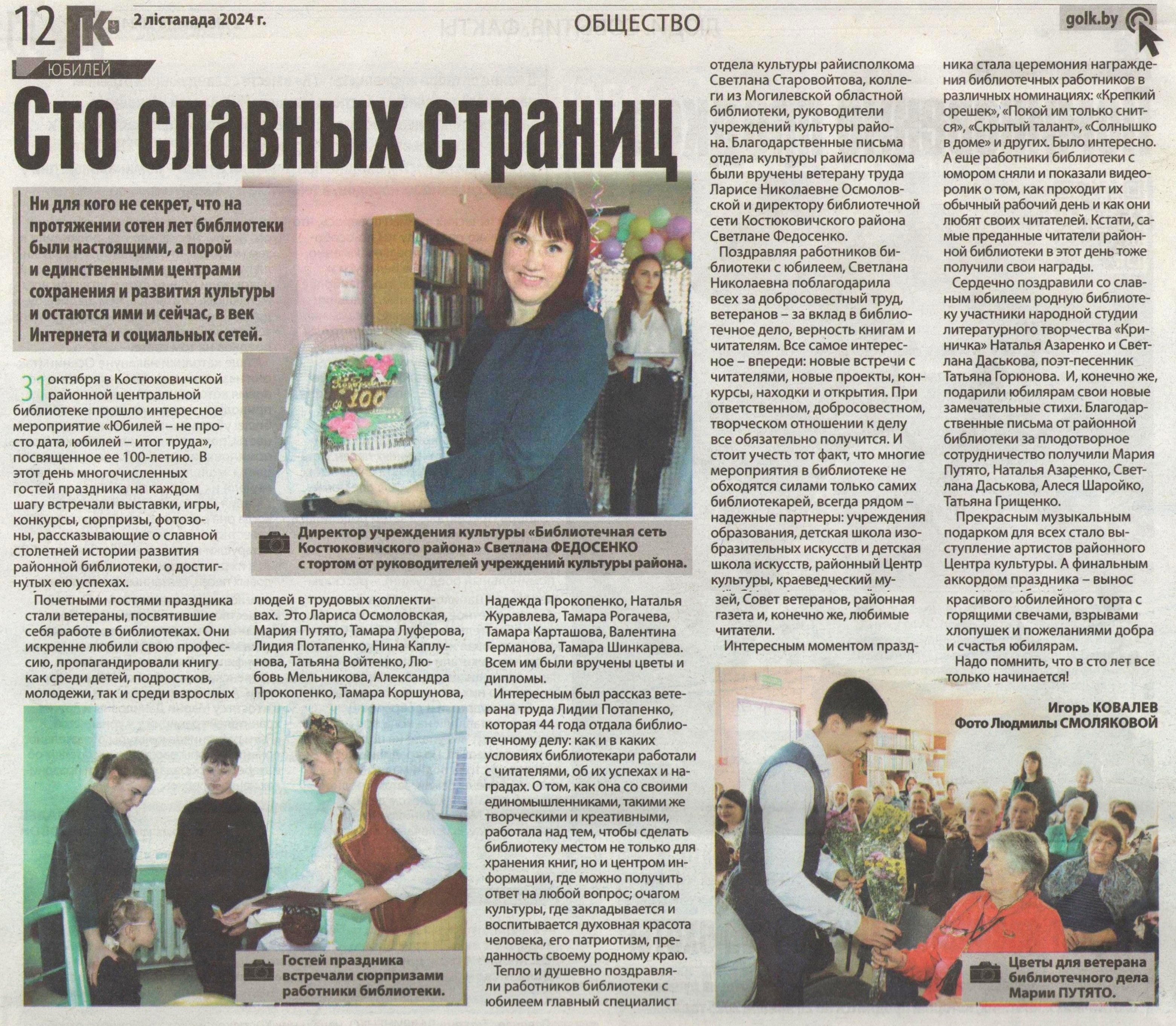 5. Ковалев, И. Сто славных страниц / Игорь Ковалев ; фото Людмилы Смоляковой // Голас Касцюкоўшчыны. — 2024. — 2 лістапада. — С. 12.