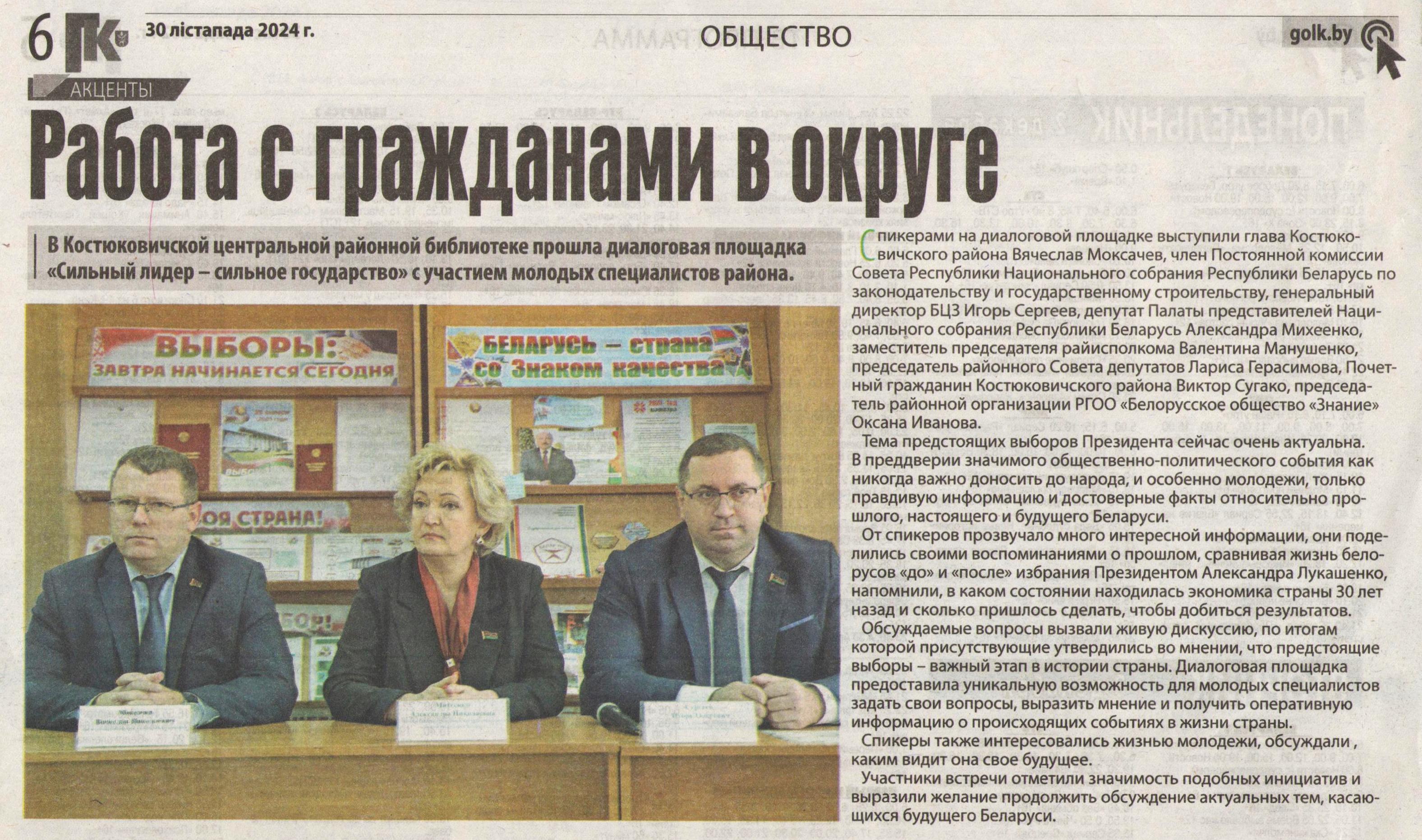 2. Глинястикова, А. Работа с гражданами в округе / Анна Глинястикова, Ольга Кривошеева ; фото Ольги Кривошеевой // Голас Касцюкоўшчыны. — 2024. — 30 лістапада. — С. 6.