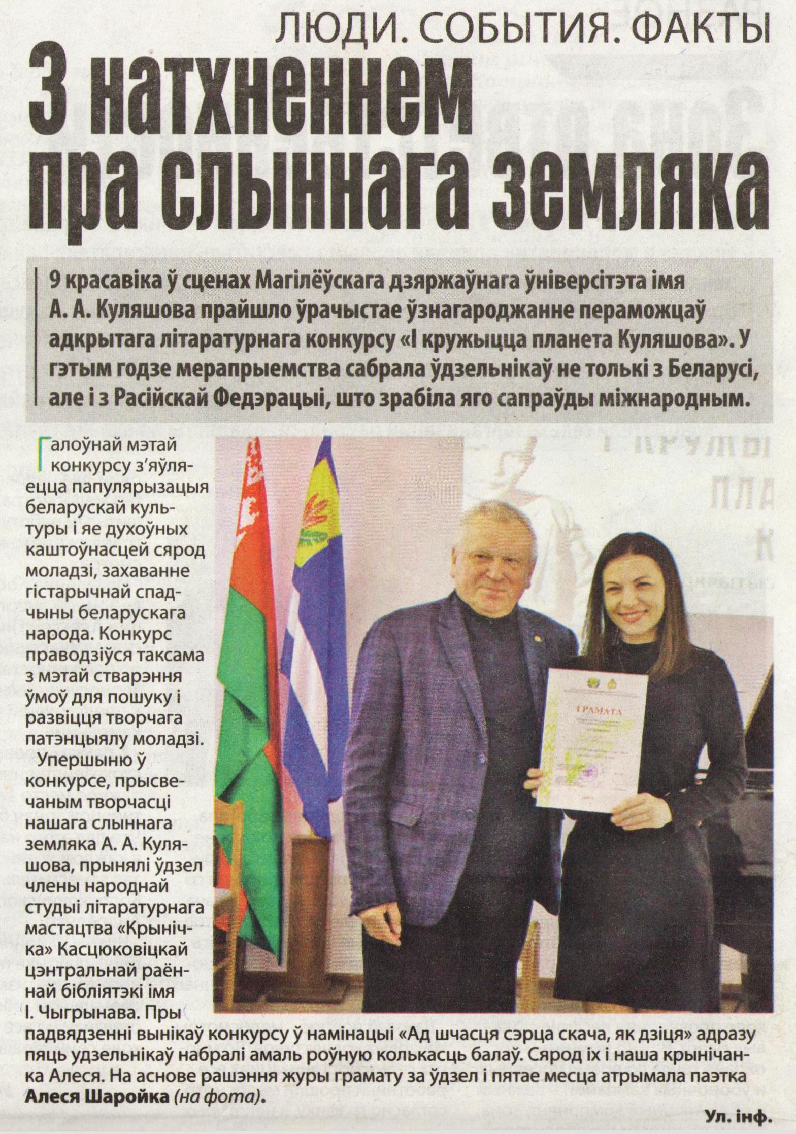 5. Дробышава, Н. Адчулі слова прыгажосць / Наталья Дробышева // Могилёвская правда. — 2013. — 4 января. — С. 14.