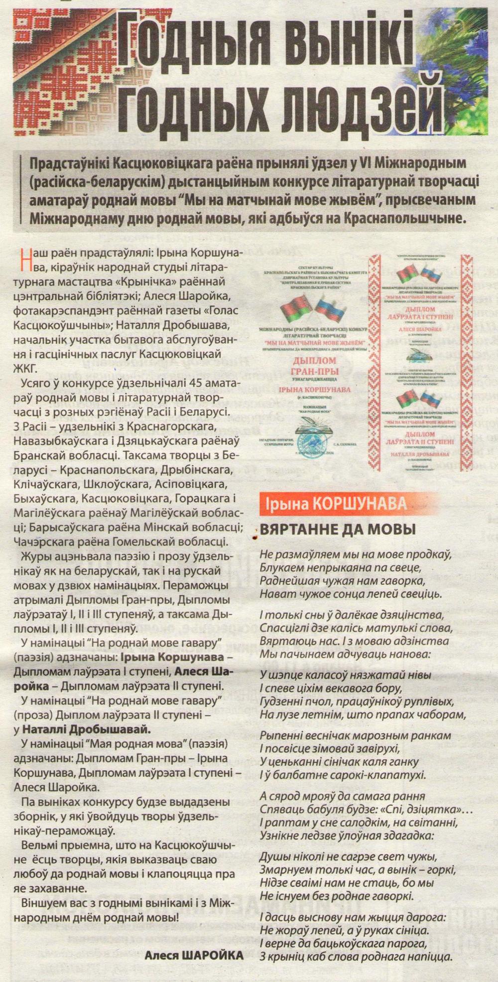 21. Кавалёва, Н. Край, які мне дарагі / Наталля Кавалёва // Голас Касцюкоўшчыны. — 2015. — 25 сакавіка. — С. 11.