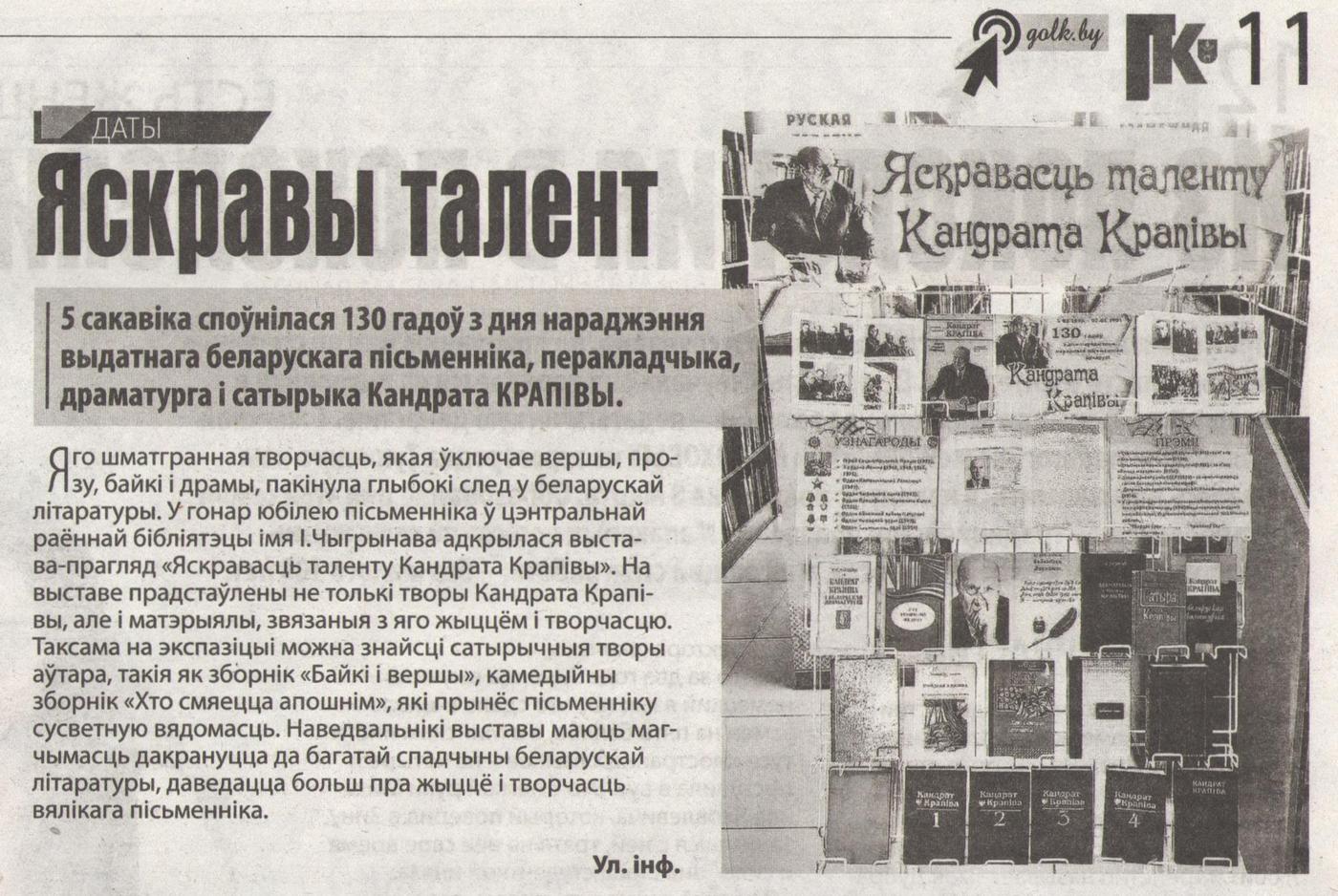 3. Петрусевич, И. Приурочили к юбилею выставку / Ирина Петрусевич // Голас Касцюкоўшчыны. — 2013. — 12 января. — С. 5.