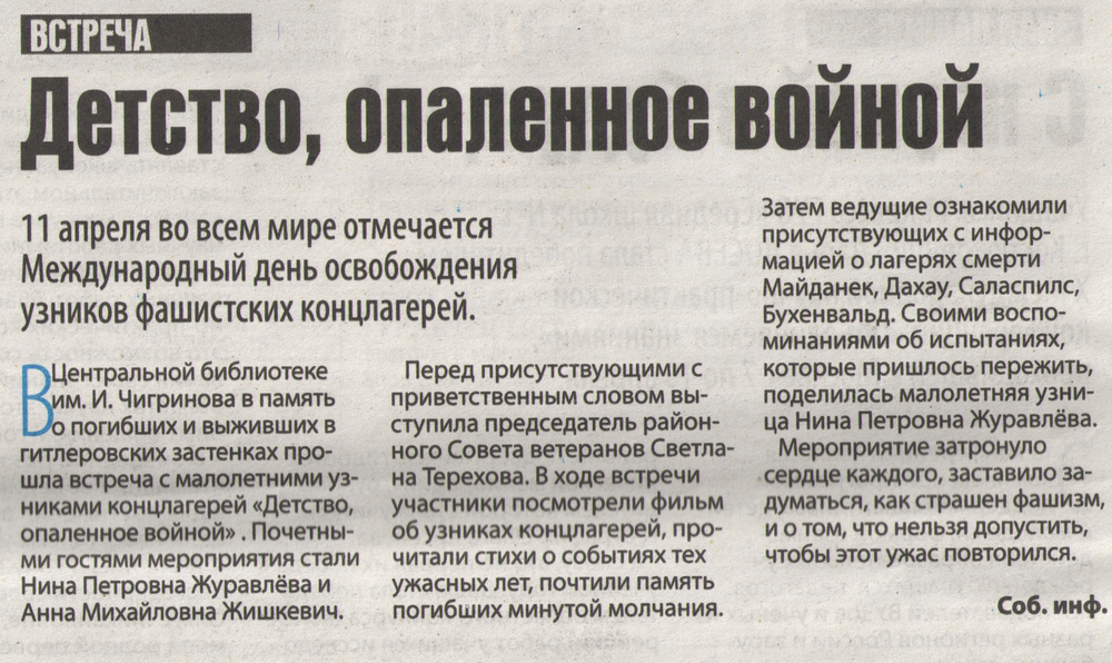 12. Савченко, С. Звенящая болью история / Светлана Савченко, Анна Потапенко // Голас Касцюкоўшчыны. — 2023. — 25 сакавіка. — С. 12.
