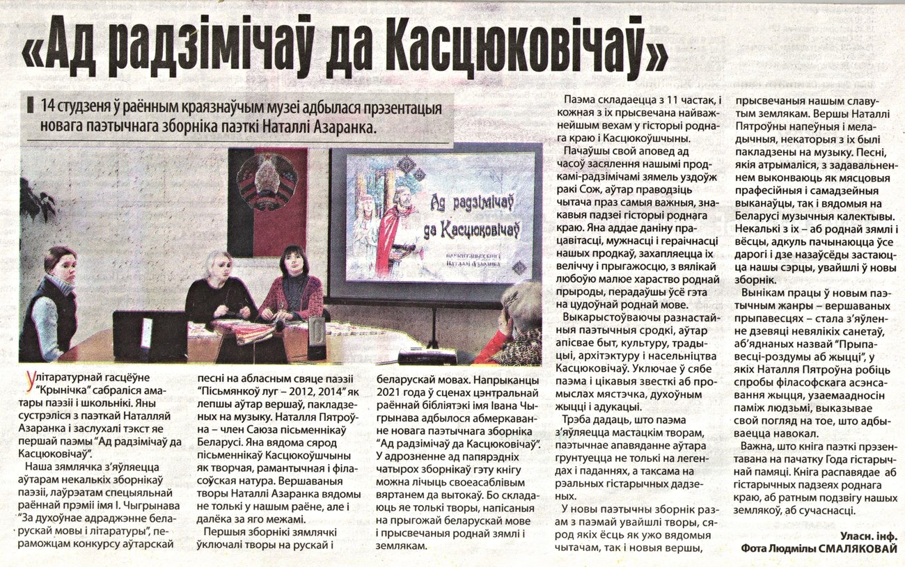 11. Азаранка, Н. Расказалі пра вайну / Наталля Азаранка // Голас Касцюкоўшчыны. — 2022. — 7 мая. — С. 4.