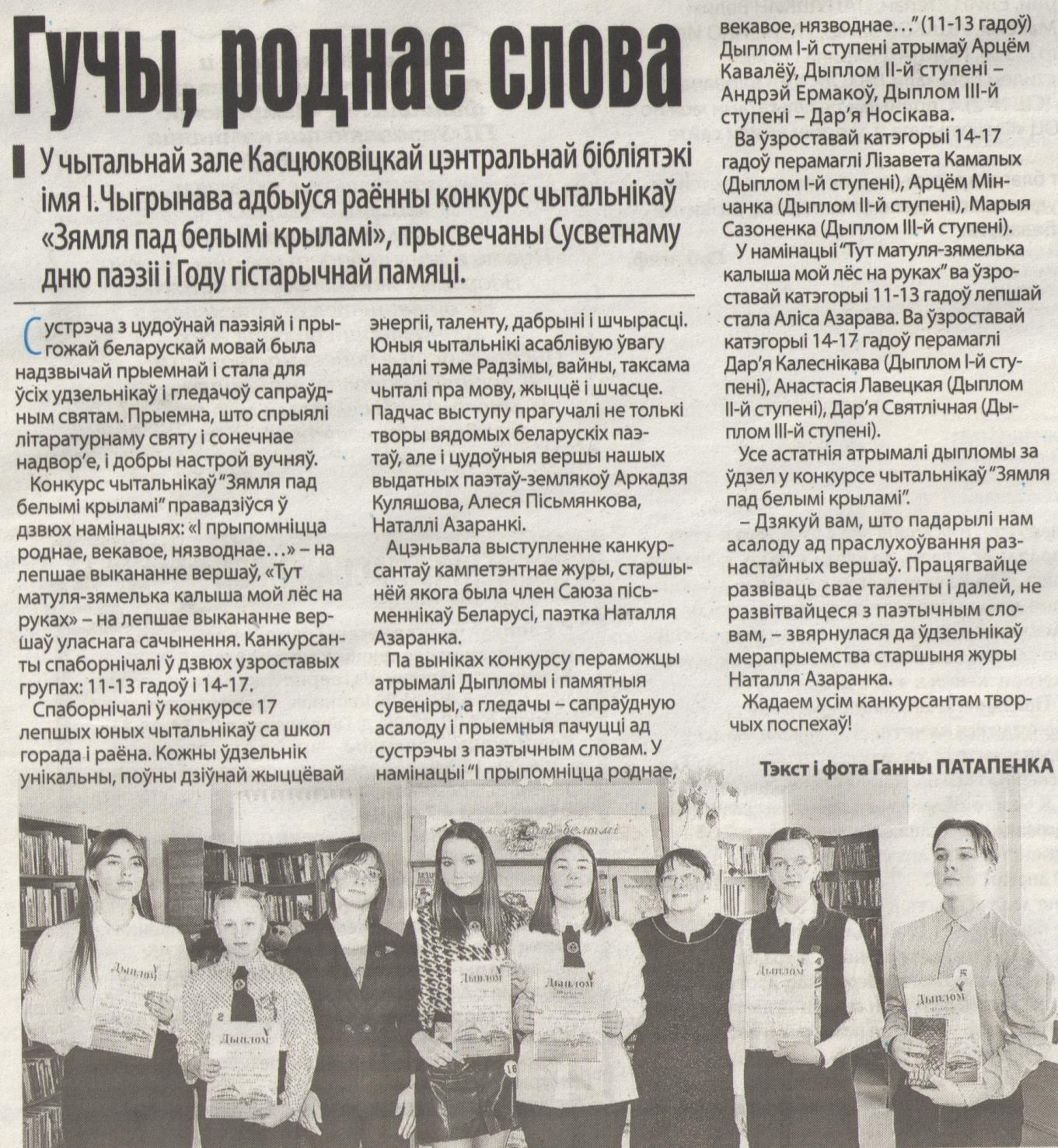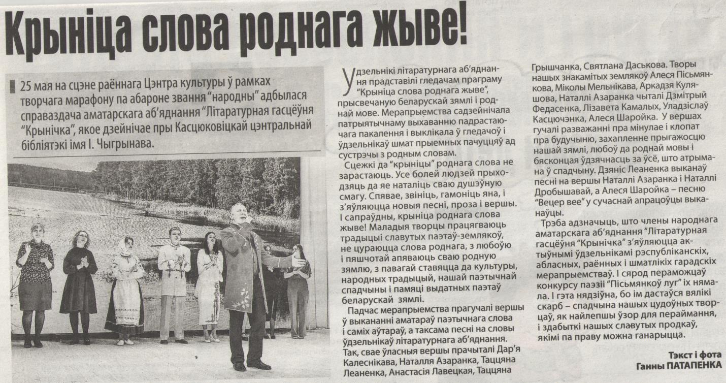 10. Патапенка, Г. Крыніца слова роднага жыве! / Ганна Патапенка // Голас Касцюкоўшчыны. — 2022. — 1 чэрвеня. — С. 7.